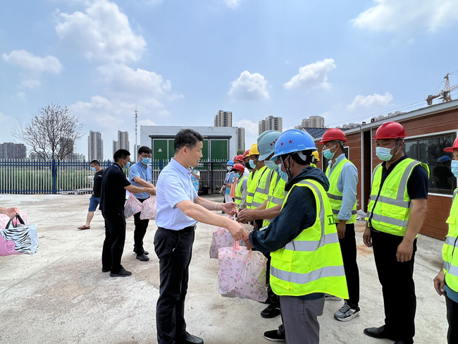 為切實維護(hù)高溫期間建筑工人身體健康,保障建筑工人在生產(chǎn)過程中的安全與健康,切實做好安全文明施工,確保工程項目順利推進(jìn)。7月1日上午,總經(jīng)理劉建華帶隊慰問建設(shè)工程施工現(xiàn)場工人,給他們送去毛巾、香皂、洗發(fā)水等防暑降溫用品,感謝他們對園區(qū)工程建設(shè)作出的貢獻(xiàn)。