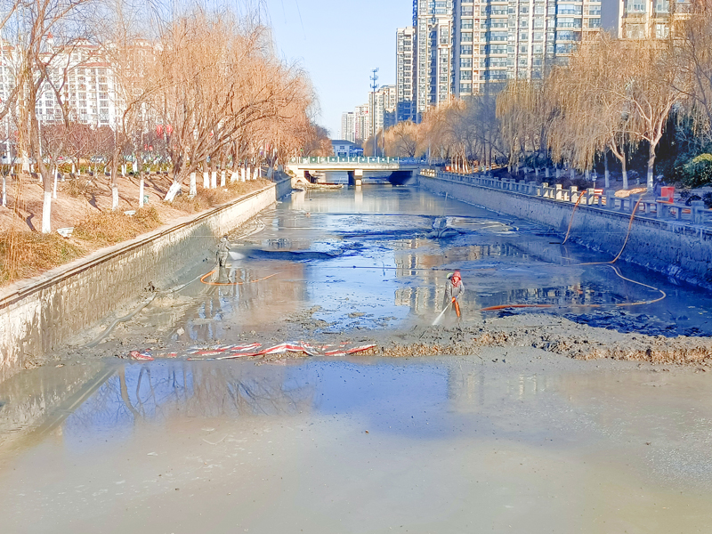 園區(qū)利民河全長(zhǎng)1.1公里、寬20米,為區(qū)內(nèi)景觀河。經(jīng)前期摸排,河道內(nèi)淤泥沉積較多,影響河道自凈能力。城發(fā)公司克服冬季氣溫低、斷面長(zhǎng)、施工難等不利因素,采用泥漿泵配合高壓水槍射水,管道封閉運(yùn)輸?shù)氖┕し椒?,清理淤泥約8500立方米,高效完成河道清淤工作。
