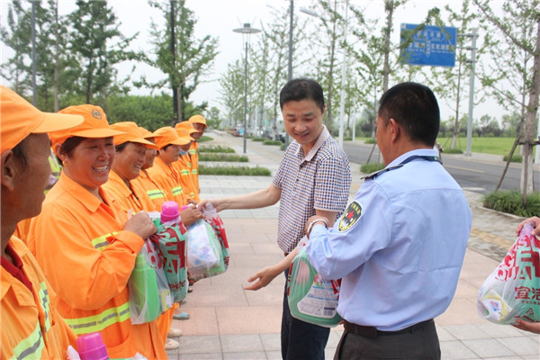 在慰問現(xiàn)場,許紹杰與城市維護(hù)工人親切交談,詢問他們的身體狀況以及高溫天氣工作、生活情況,叮囑大家在夏季高溫時(shí)段要注意休息,勞逸結(jié)合,防止高溫中暑。溫暖的話語讓大家深切感受到黨的關(guān)懷和溫暖,紛紛表示要繼續(xù)發(fā)揚(yáng)“不怕苦、不怕累、不怕臟”的精神,把園區(qū)城市維護(hù)工作做得更好。